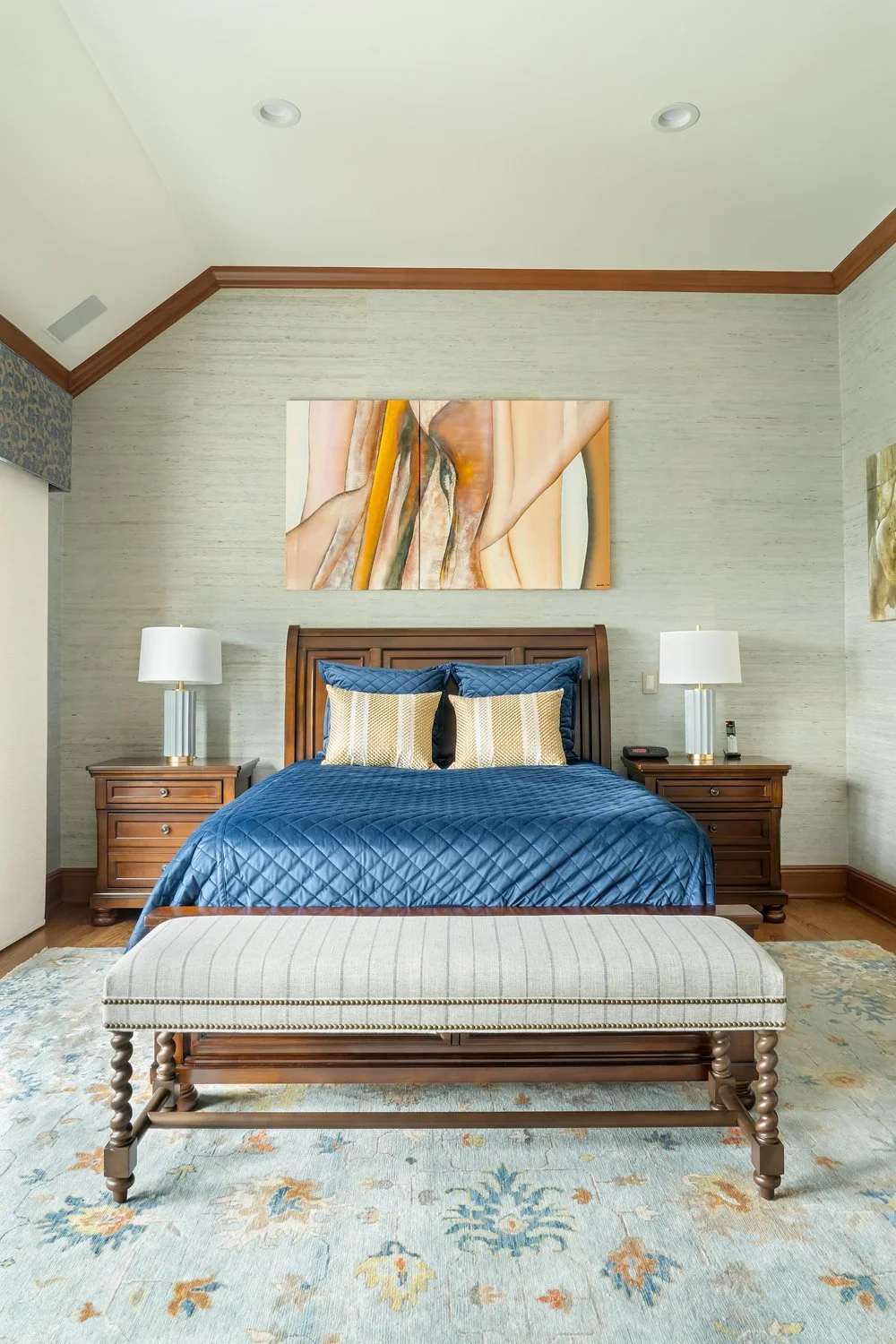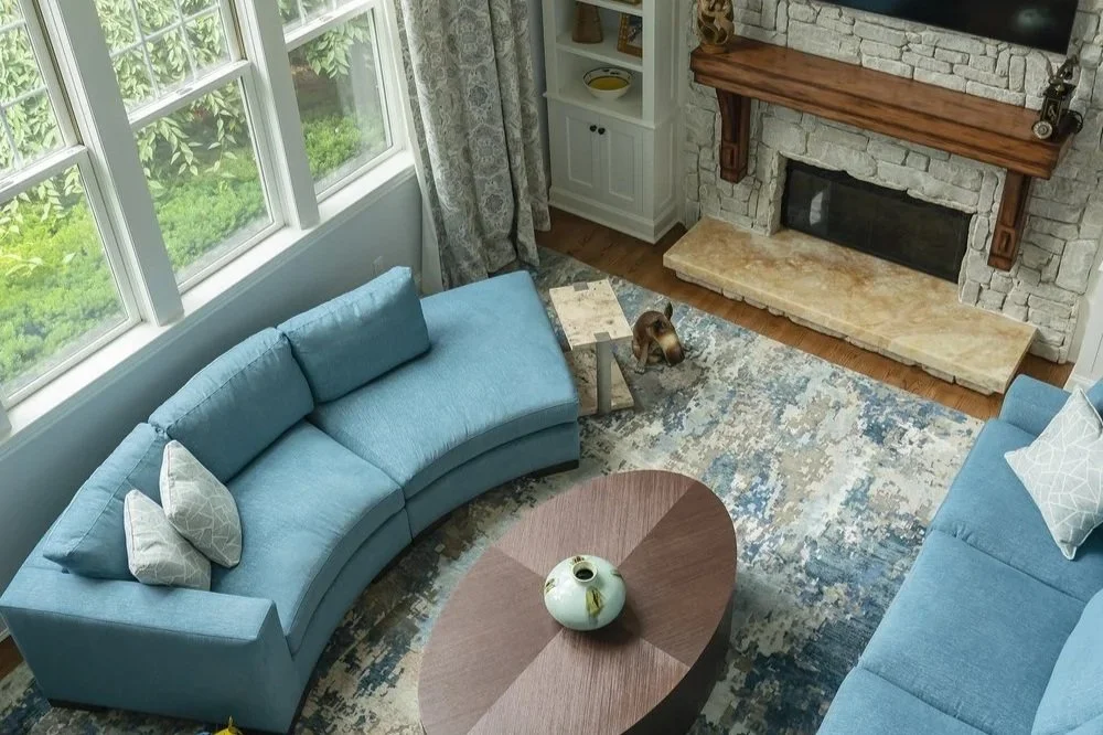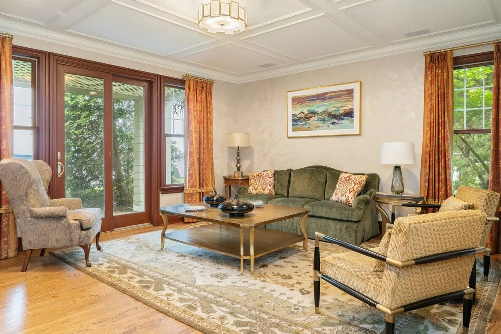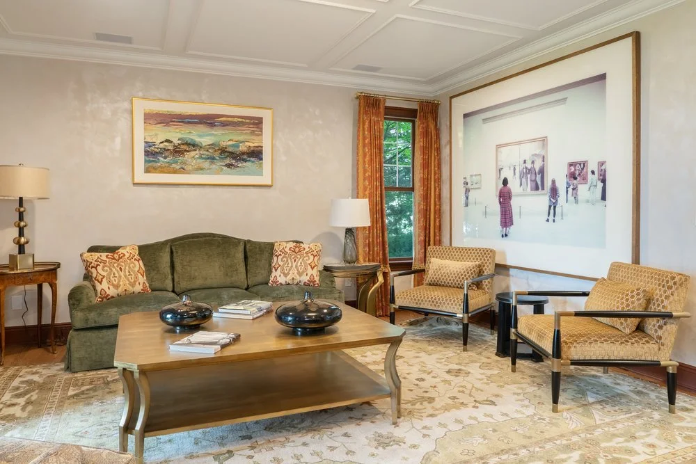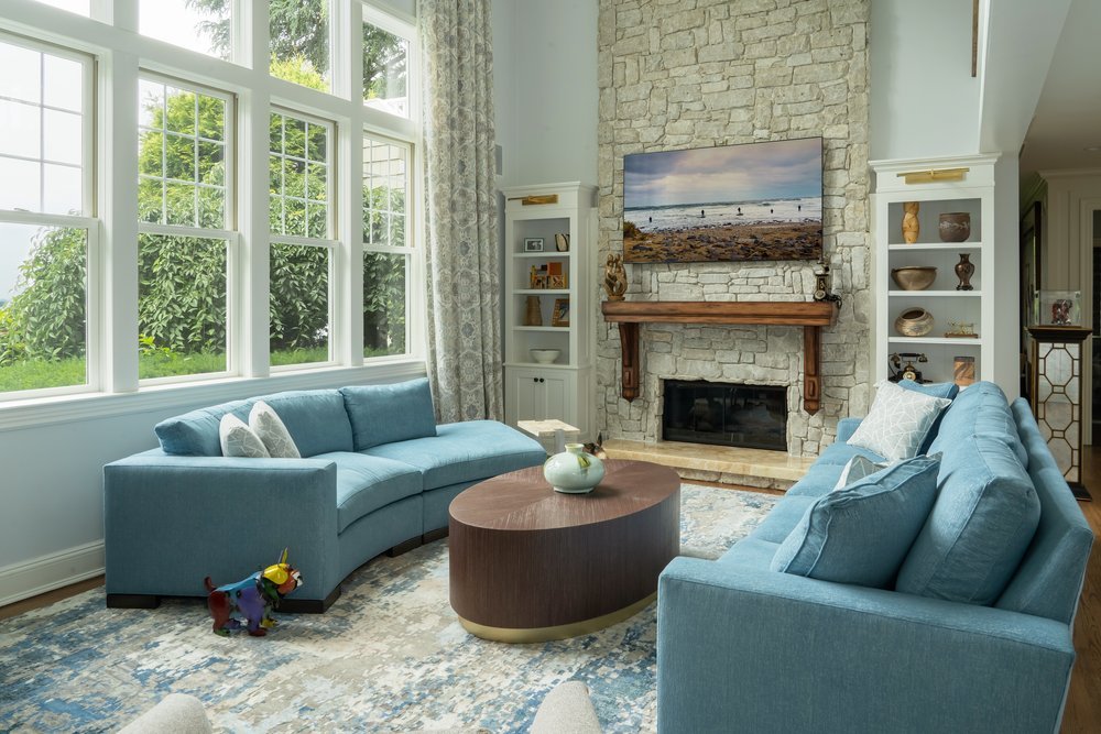 Our client purchased this dated property with incredible charm and traditional details. We orchestrated a complete reimagining, reconfiguring the floor plan while keeping the warm, cozy feeling of the spaces. Rich textures, curated furnishings, and thoughtful lighting elevate every corner—from the stone fireplace and built-in shelving to the grand chandelier in the entryway. Whether it's the cozy elegance of the blue sectional or the timeless grace of the green parlor, this transformation reflects a refined yet livable aesthetic tailored for comfort and style.