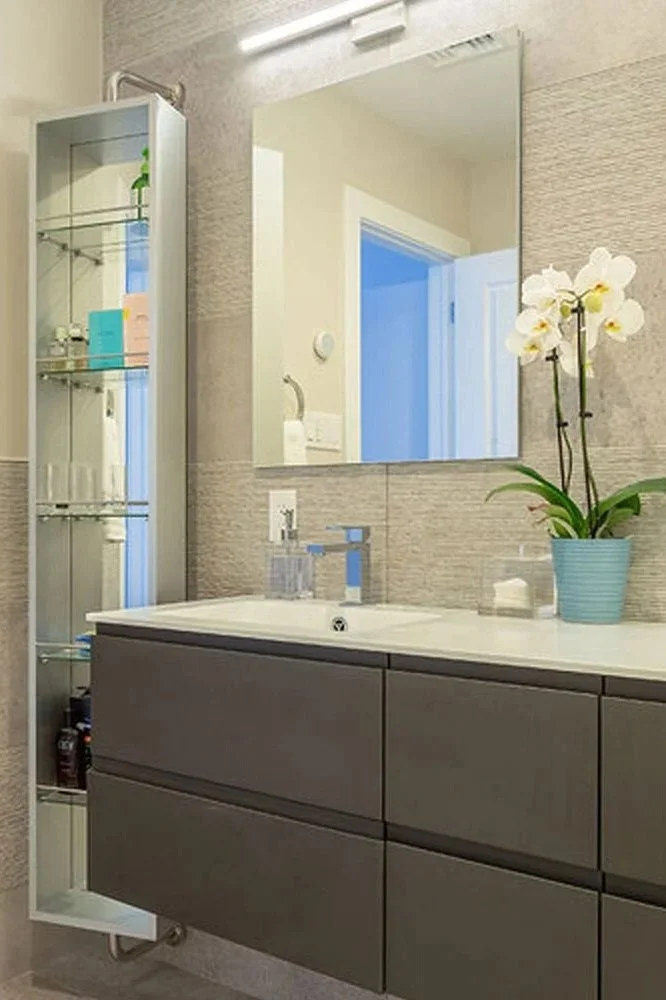 This renovation in Port Washington is a blend of architectural refinement and modern luxury. The kitchen is a study in sleek sophistication, where high-gloss cabinetry and curated Italian design elements create a polished ambiance. A key design triumph was the seamless integration of the existing curved window facade, allowing natural light to flood the space while framing the culinary experience. In the great room, the original rustic ceiling was replaced with a tailored, contemporary structure that elevates the space—the transformation crowned by the Luceplan Mesh suspension light fixture—a sculptural centerpiece that casts a delicate glow across the vaulted space.