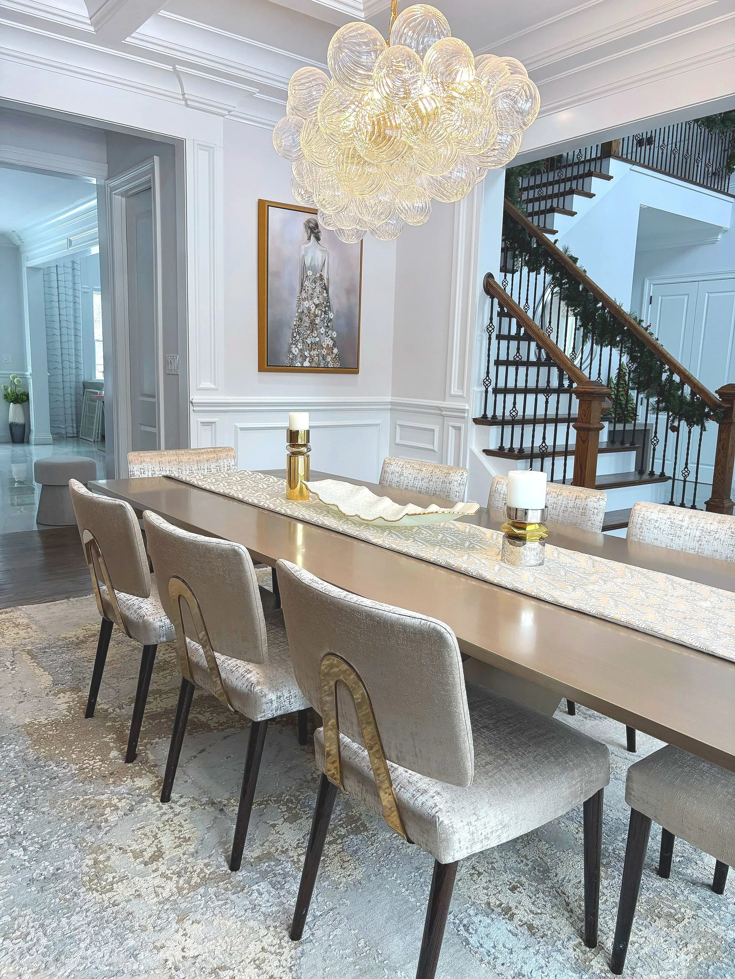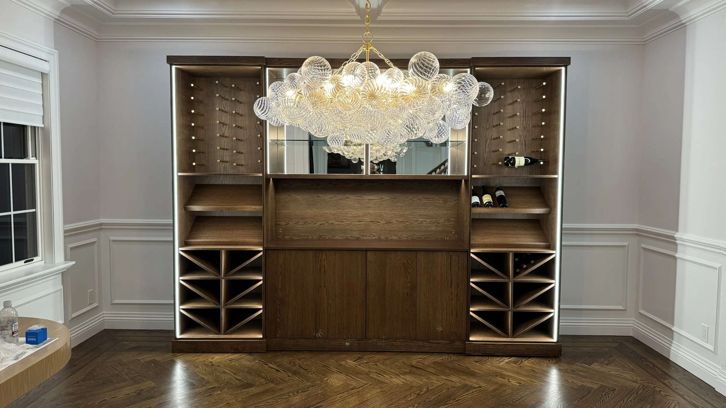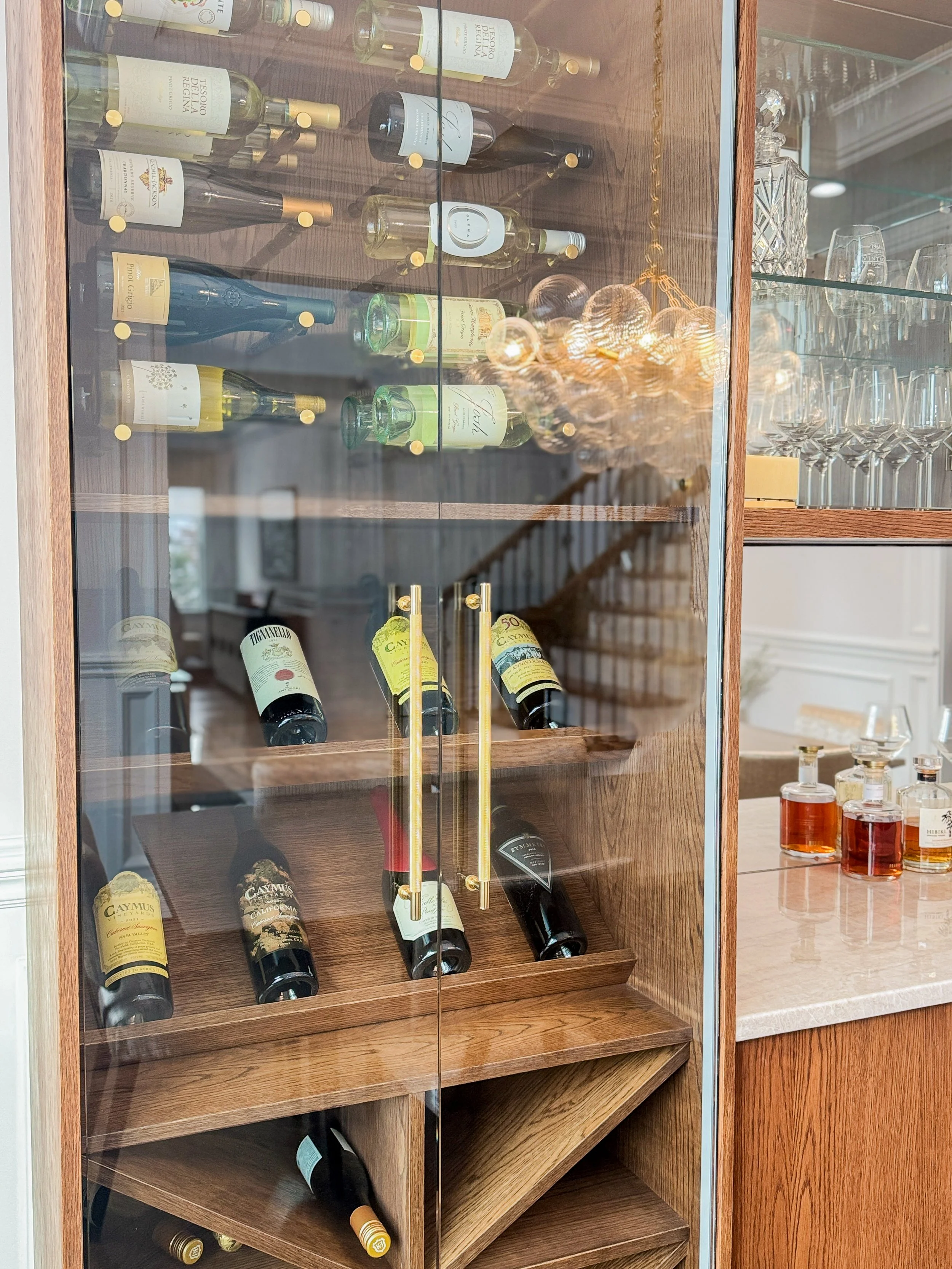This home is a portrait of luxury and tailored elegance. At the heart of this full-home renovation is the dining room with a bespoke wine bar—an illuminated showcase of curated bottles and glassware framed by glass doors and tailored millwork. It’s a statement of refinement and celebration, anchoring the space with both function and flair. Every detail of this home was designed to evoke warmth, sophistication, and timeless beauty. Stay tuned—the transformation continues with the reveal of the basement, soon to become the ultimate entertaining space complete with a full bar and cigar lounge.
